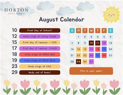 August 29: Andy is out of town. Monday After School Lessons will be made up within the month!