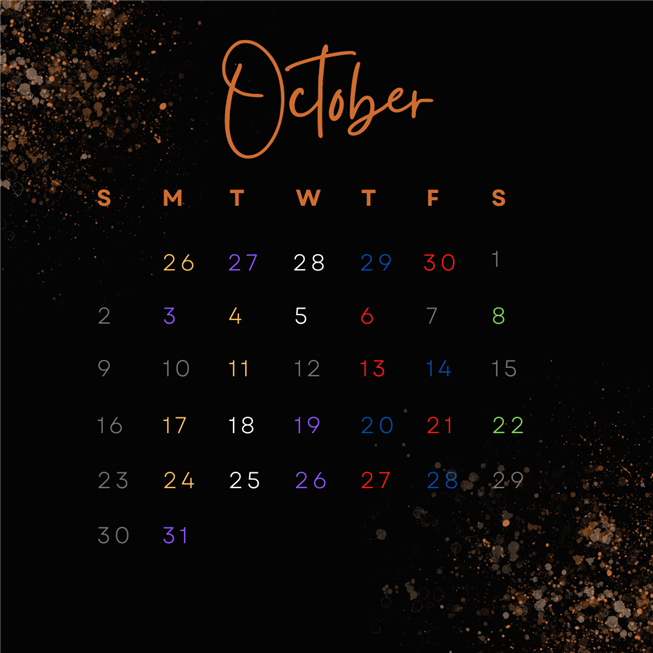October's schedule is more complicated than the other months have been so far. Here's a breakdown of the weeks: