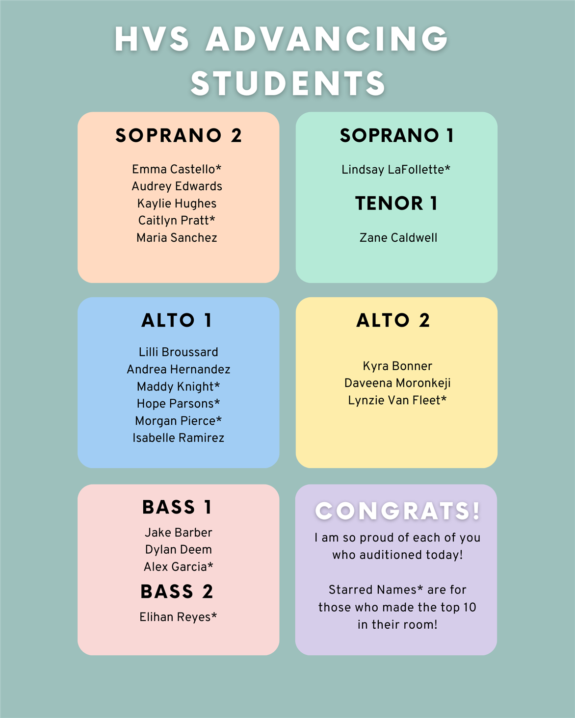 Congratulations to all students who participated in the District Auditions. Here's a list of our advancing students!